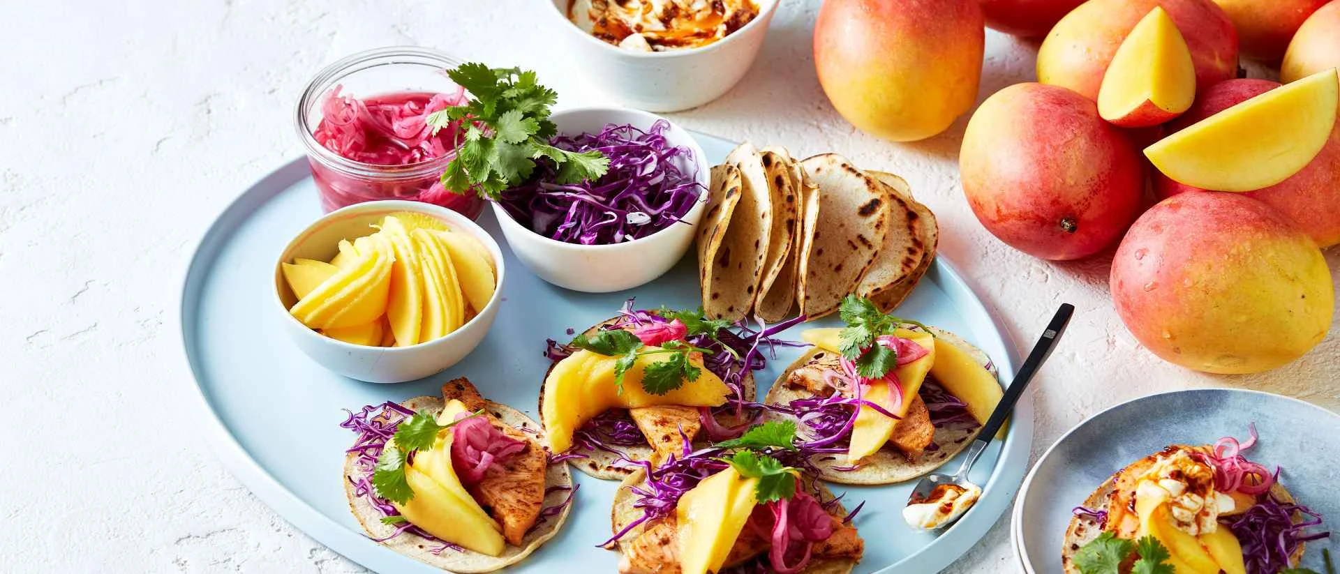 STEP 5 Top the tortillas with cabbage, salmon, pickled red onion, mango and coriander. Drizzle with the chipotle yoghurt and serve.